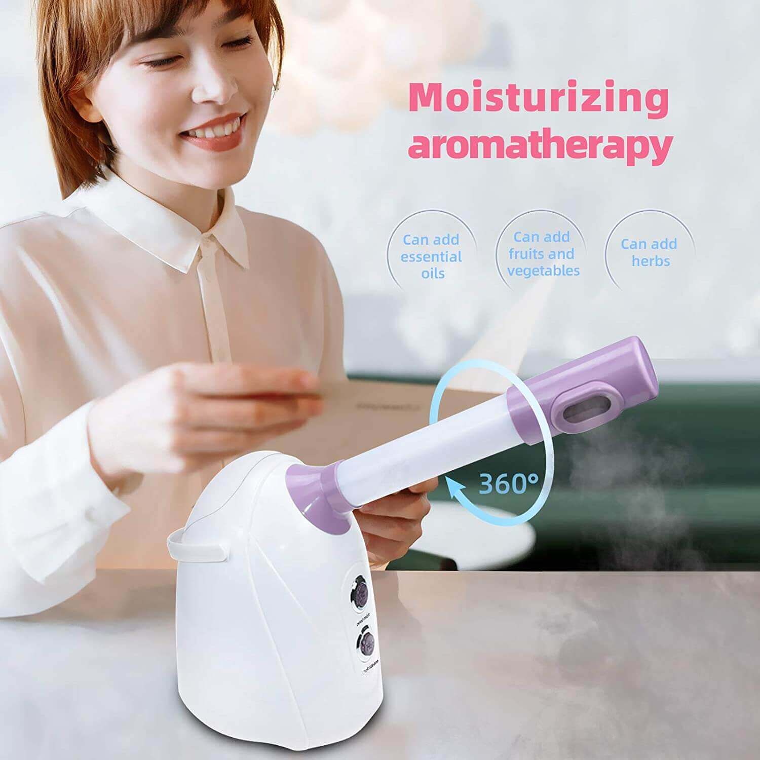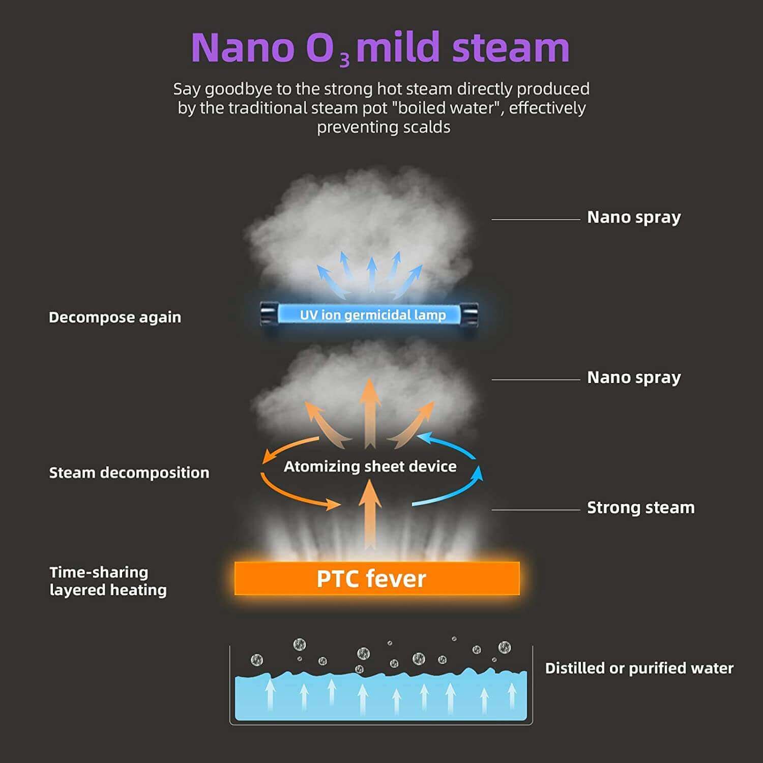 1. حالت بخار صورت NANO MIST 360 درجه : در درجه اول حالت سرد و یا گرم را بر اساس نیاز خود انتخاب نمایید . برای حالت گرم باید حدودا 8 اینچ با قسمت پخش بخار فاصله داشته باشید .